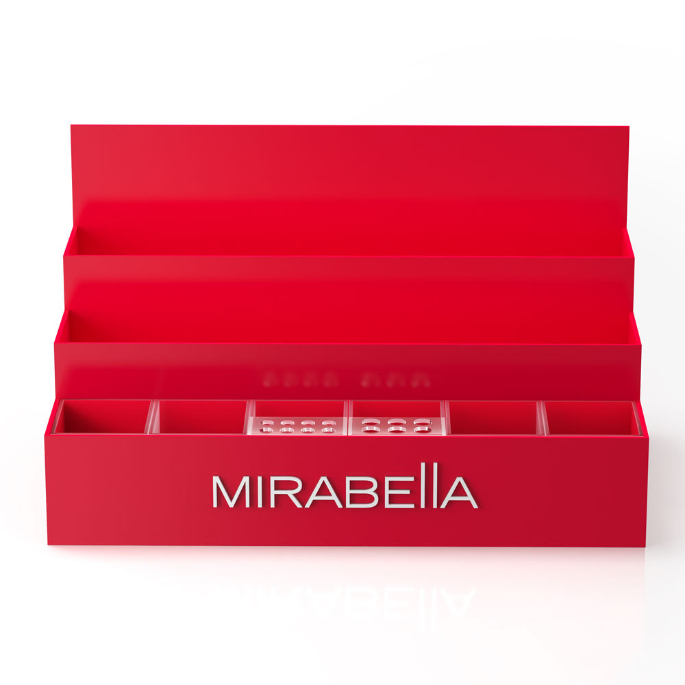 A stunning floor unit display featuring Mirabella's product line in a smaller, luxurious footprint for salons and spas.